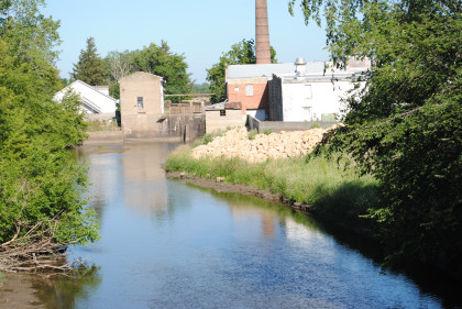 The remaining portion of the Spaulding Manufacturing Company smoke stack; the top few feet of it fell years ago so it just reads "Aulding". The "Cedar Rapids" set off a hot box detector so we had to stop to inspect it.