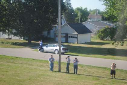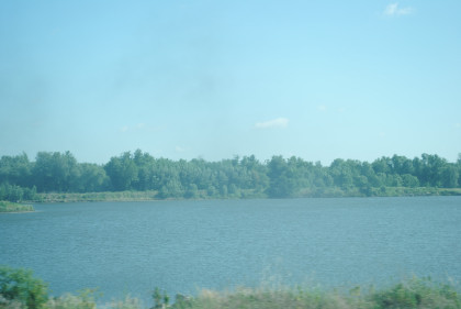 We ran by this lake before we arrived at Marengo and those who wanted to participate in the photo runby detrained. I suggested to Kathie that she join in so she could see her first photo runby. I would walk down the road to the point where I could get the grain silos behind our train.