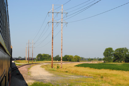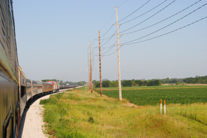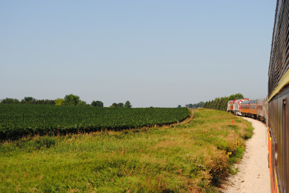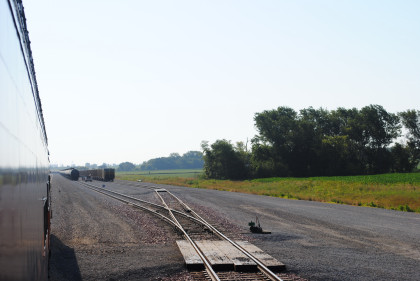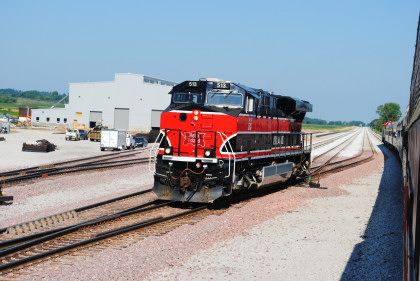 Iowa Interstate ES44AC 513 in Rock Island heritage paint scheme passed us on its way to the front of our train, which was really the rear. We left the shop area and pulled down to the east switch, but had to wait for a switch lock to be removed. We departed Yocum Connection at 9:46 AM for Rock Island running backwards on the way to Iowa City.