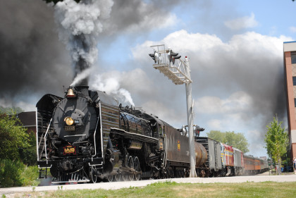 Iowa Interstate 2-10-2 QJ 6988 was waiting to be put on the point of our train in Rock Island. We pulled down into the Iowa Interstate Yard and stopped to couple the steam engine. Once the air test was completed, we re-crossed the Mississippi River and headed to the Lafayette Park for lunch and a photo runby after our meal today.