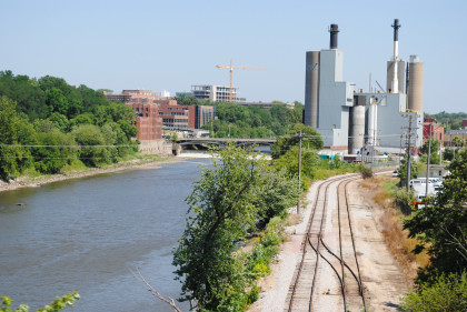The Cedar Rapids and Iowa City Railroad (Crandic) tracks run along the Iowa River.