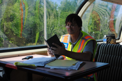 I was up at 5:00 AM and after showering and shaving, I walked over to Casey's for more doughnuts and orange juice. I put the corrections in yesterday's story and posted it before I walked over to the Clarion Hotel and boarded the bus. We had the safety meeting on the bus and then loaded 13 other passengers before we were driven out to our waiting train at Dow-Smith Yard, where I put my stuff in the rear seat of the "Sky View".