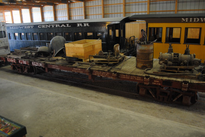 Midwest Central coach 200 "Mignon" was built from scratch on one of the 4' x 30' flat cars bought from the Southern Pacific's abandoned Keeler branch in 1961. The flat car used for "Mignon" was the only all-steel construction Southern Pacific narrow gauge flat car built. This was also the last flat car in service on the Southern Pacific narrow gauge as it hauled the wrecking crane that was used to pull up the rail behind it as it made its last trip.