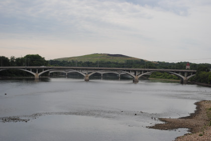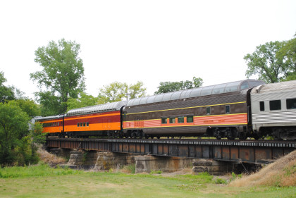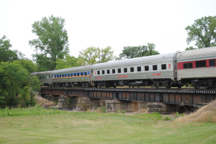 The train with the Skytop observation car "Cedar Rapids" crossing the Cedar River in Cedar Rapids.