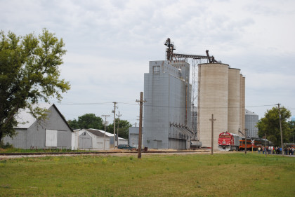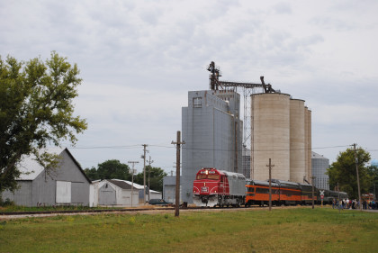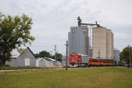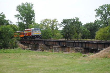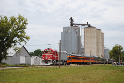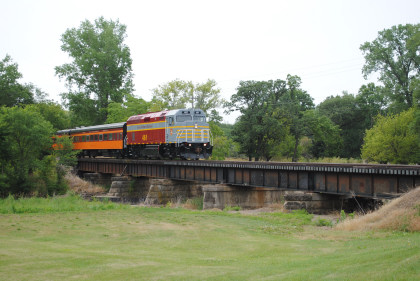 The train crossed the Cedar River with old cement and stone abutments from the former Chicago, Milwaukee St. Paul and Pacific line between Marion (to the east) and Elberon (to the west). We then proceeded through Palo before crossing Bear Creek on a six-span deck plate girder bridge, and into Shellsburg where we stopped for the first photo runby of the day.