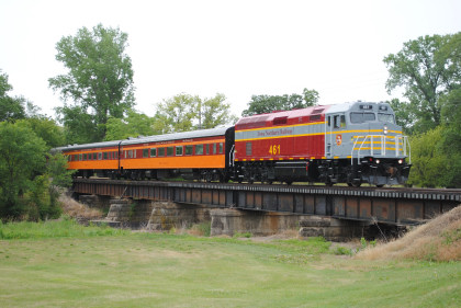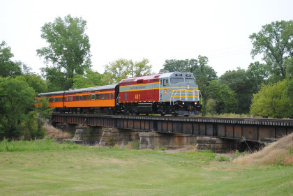 The Train's ConsistIowa Northern F40PH 451, NSRX coach 202 "Wenonah" PPCX 800261, NSRX coach 203 " Nokomis" PPCX 800898, NSRX coach 7616 "Lake Pepin" PPCX 800799, NRHX 142 "Franklin Inn" PPCX 800957, "Braddock Inn" PPCX 800854, New York Central tavern lounge 38 PPCX 800655, High Iron dome 60 "Scenic View" (former Santa Fe 551), NSRX "Super Dome" 53 PPCX 800862, NRSX Skytop Lounge Observation 186 "Cedar Rapids" PPCX 800040 and Iowa Northern F40PH 678.