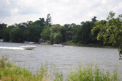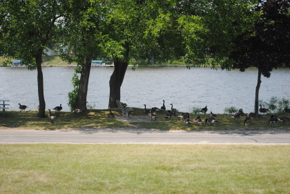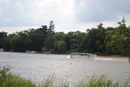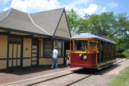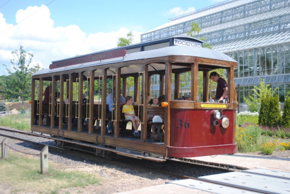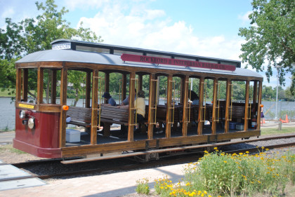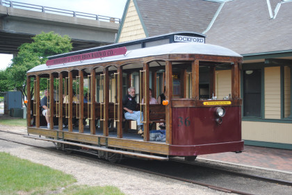 The Rockford Park District operates a gas-powered open-bench trolley car, 36, over about 1.7 miles of railroad track that runs along the Rock River northward from a station just north of Jefferson Street in downtown Rockford. This is an excursion-type service that normally runs Wednesday through Sunday during the summer months. Passengers ride from the trolley station in Riverview Park, ride along Madison Street beside the scenic Rock River Recreation Path, stop for a brief visit to the Eclipse Lagoon and Gardens, travel to the Symbol, then turn around and return to the Trolley Station.