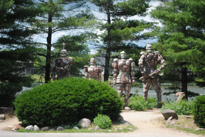 A stoic quartet of golems known as the Rockmen Guardians who have acted as silent sentinels of the City of Rockford since the late 1980s. Created by Milwaukee artist Terese Agnew in 1987, the four stone figures cut proud silhouettes in their secluded spot in Sinnissippi Park. The 12-foot tall guardians are made up completely of boulders, each weighing hundreds of pounds, and held together with cement. They each hold a different superheroic pose with the obvious leader holding his hand on a rocky sword, ready for battle.