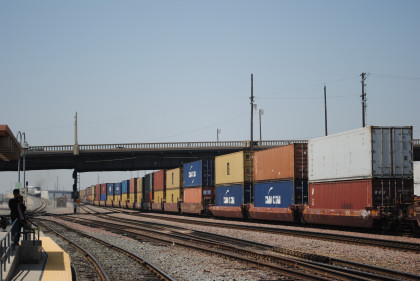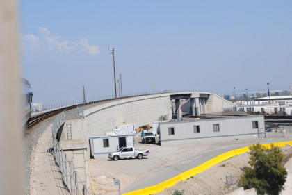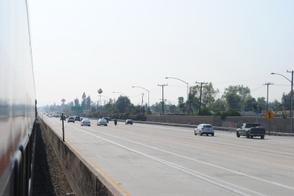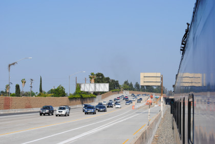 The train heads for the middle of the San Bernardino Freeway.