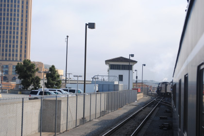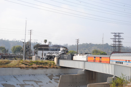 The steam train was heading to the Los Angeles River with my train home, Surfliner 784, going by Mission Tower.