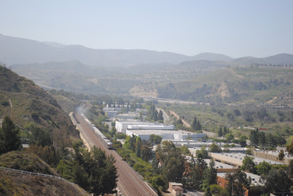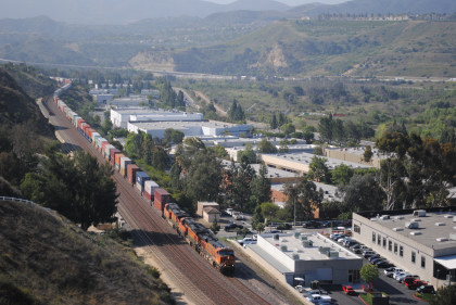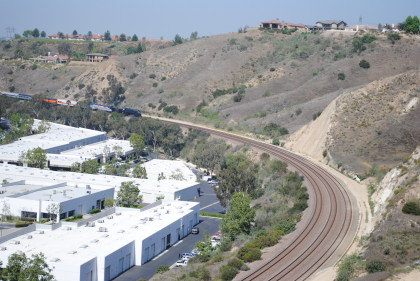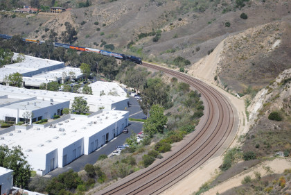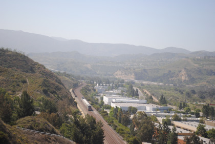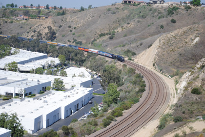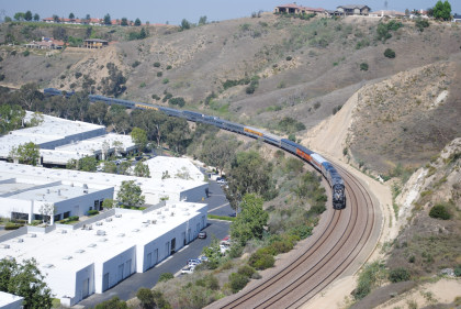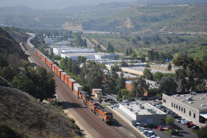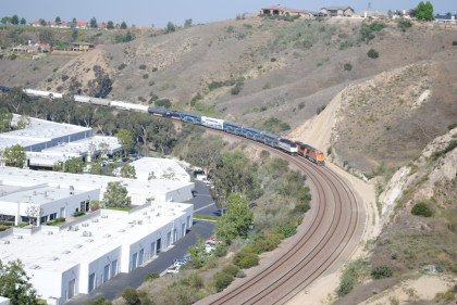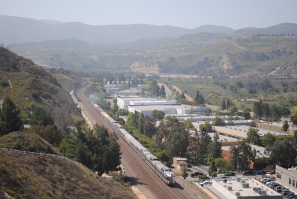 Metrolink 607 arrived and Chris had his first ride in the Hyundai-Rotem cab bar. It was a quick trip to Fullerton and we detrained then found Carl Morrison, our driver for the day, before we departed and drove over to where Larry Boerio parked three blocks south of the station. From here we drove out to bridle trail out at the Horseshoe Bend in Santa Ana Canyon. We hiked up to my favorite spot and this was the first time Carl, Larry or Chris had taken photographs from this location. We did not have long for our first train of the day to arrive.