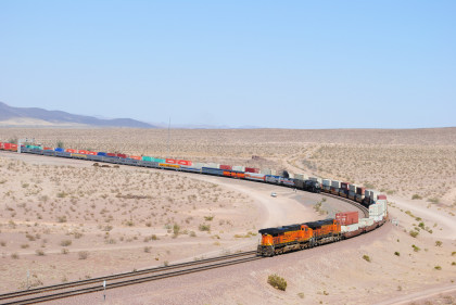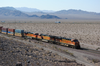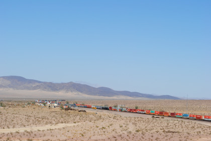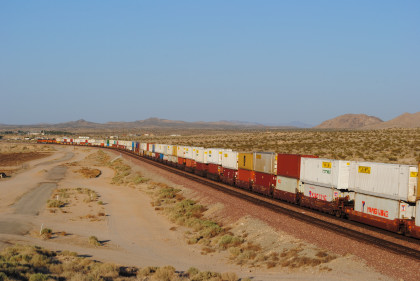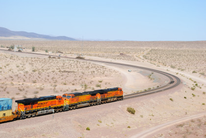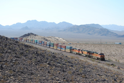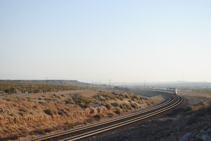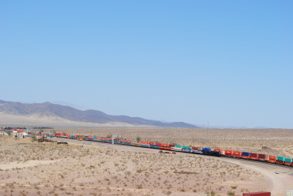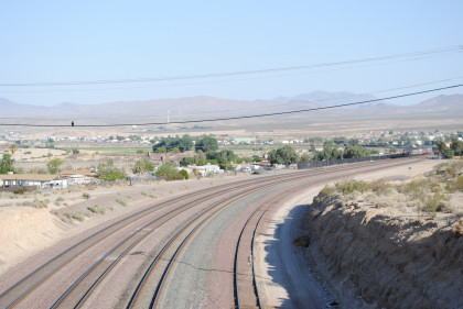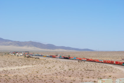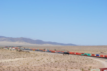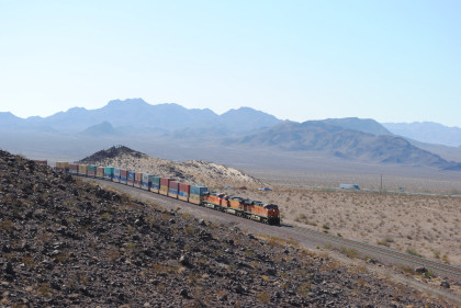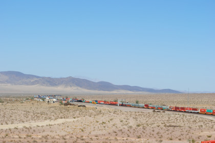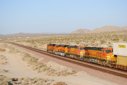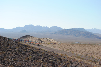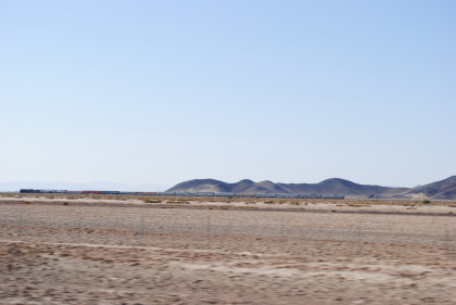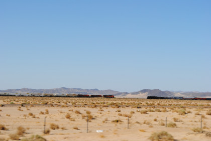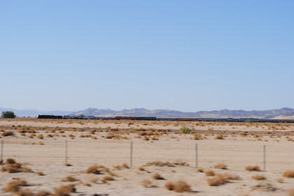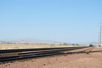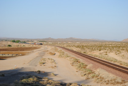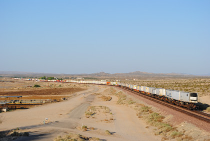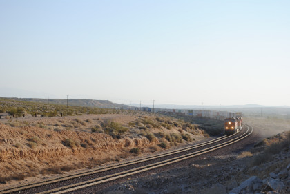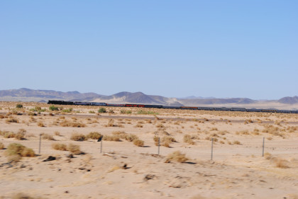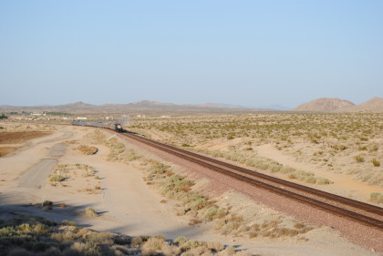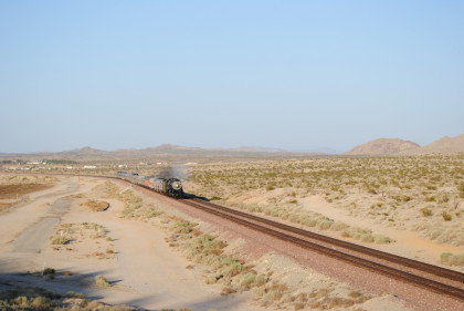 Desert view looking north. We spotted Santa Fe 3751 coming westbound towards us but here also came an eastbound BNSF stack train. Would it clear in time for our pictures?
