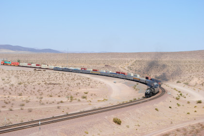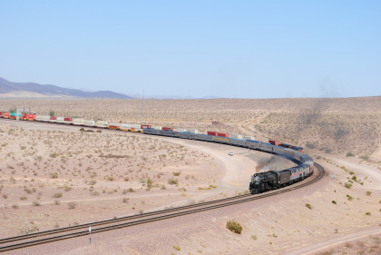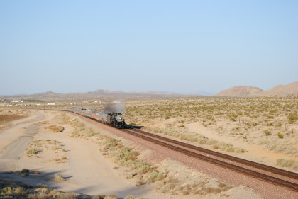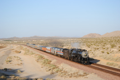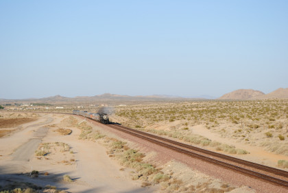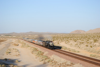 Santa Fe 3751 meeting an eastbound BNSF freight at track speed. The steam train received an order to flag the Mountain View Road grade crossing in Newberry Springs and Bill and I set up just west of there.