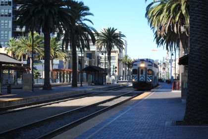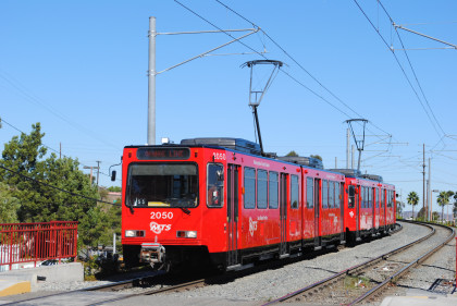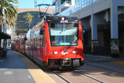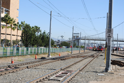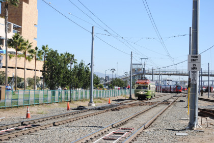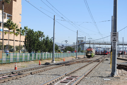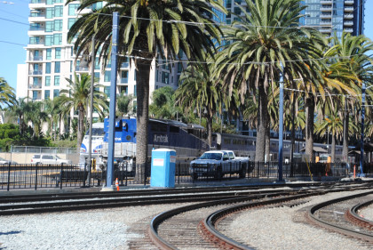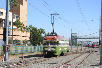 The Amtrak station. Unlike my last non-stop trip on the Silver Line, this time we made all of the normal stops, namely Gaslamp Quarter, Convention Center, Seaport Village, America Plaza, Civic Center, Fifth Avenue, City College {under construction improvements} and Park & Market before we returned to 12th & Imperial. After a great ride, we took the Green Line back one station to the Gaslamp Quarter to get a PCC photo runby.