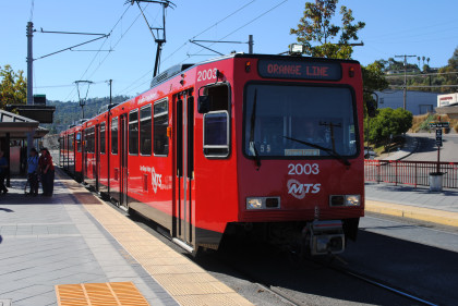 Next we ran to 70th Street station before continuing to drop along the canyon wall in order to reach the valley floor, where we stopped at Alvarado Medical Center, which has a riddle along the top of north embankment wall, reading from west to east. The trolley entered the 4,000 foot tunnel under San Diego State University and right in the middle of it is SDSU Transit Center station. We exited the tunnel and came out into a small canyon and crossed a bridge then dropped down the 4.4 percent grade along the cliff, losing elevation before crossed over Interstate 8 to Grantville station, which is located 40 feet above the ground, then crossed the San Diego River.