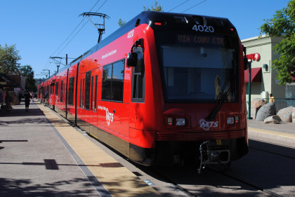 Our Green Line train would wait until the connecting Orange Line one left for El Cajon. Once it did, we departed, stopping at Seaport Village, Convention Center, Gaslamp Quarter and then our last stop at 12th/Imperial. Once we arrived, we found out that the Blue Line was shut down from 12th/Imperial to 24th Street with buses substituing for the trolleys. It was time for a new plan so we would go to La Mesa and see the depot and railroad display there, then go to El Cajon and onto Santee, where we would meet AC Adam for lunch.