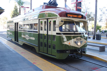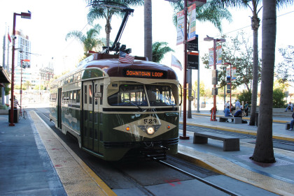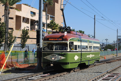 San Diego PCC Car 529 built by St. Louis Car Company in 1946. It operated in St. Louis before it went to Muni in San Francisco in 1957 as their 1122 and served the J, K, L, M and N lines for 25 years. This PCC car is the such car to run in San Diego since 1949.
