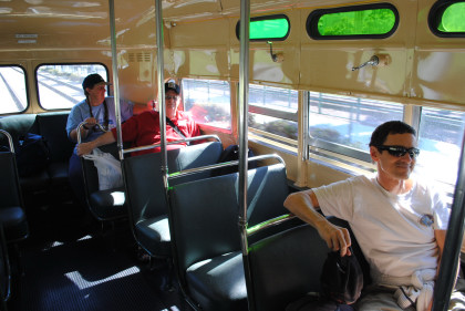 We boarded this Green Line Trolley. The new trolley line arrangements are as follows. The Blue Line now runs from San Yisdro to American Plaza, the Green Line runs from Santee via Old Town and the old bayside line to 12th/Imperial, and the Orange Line runs from the Santa Fe station to El Cajon. The limited Silver Line with the PCC car runs on a very limited schedule.