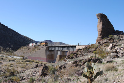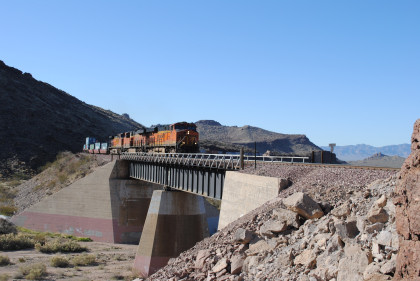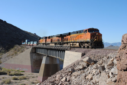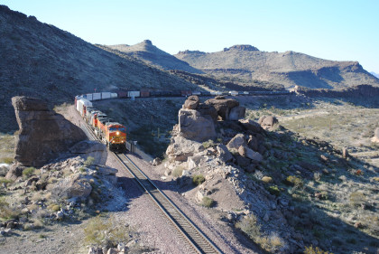 BNSF 735 West, a local, had CSX C40-8W 7653 in the power consist as it rolled though Kingman Canyon. I relocated to the sunny side after the morning mid-level clouds had dissipated.