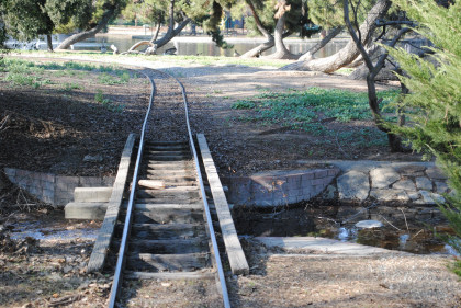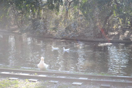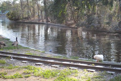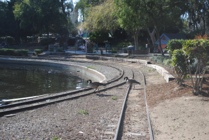 The Canada geese crossed the track and this railroad has no switches, instead just uses a shared middle rail when going either way.