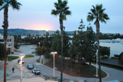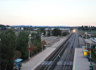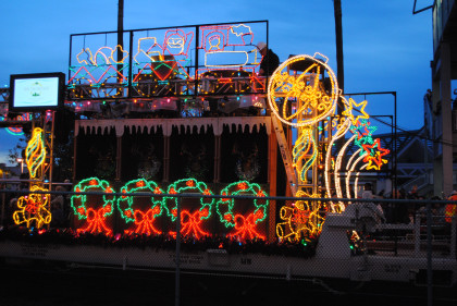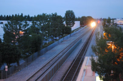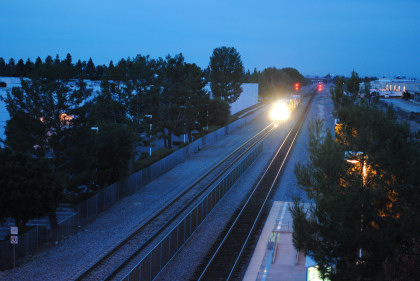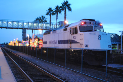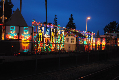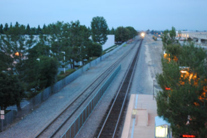 The sun has set off to the west and I saw a headlight miles off. Could this be the Metrolink Holiday Toy Express making its way to the first stop of the night at Irvine?