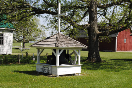 The Highland Presbyterian church bell is all that remains of that burnt structure once located at the corner of State Route 15 and Bowman Road in Defiance County. The bell was installed in the cemetery by Fred Fauth in 1970 and has two striking devices: the clapper, which strikes a double stroke calling people to worship, and the tolling hammer, which strikes a single stroke to toll the age of a member of the congregation who passed away and was being mourned.