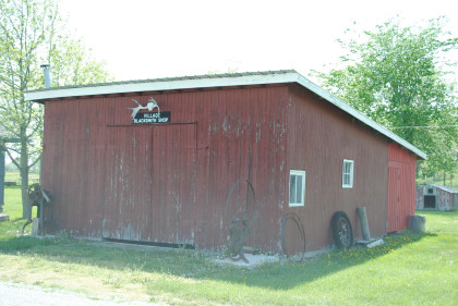 Village Blacksmith Shop. A footer and foundation were poured for the Blacksmith Shop in May 1974. It contains tools and equipment from several different area shops. A rotary hammer is from Hicksville, a hand drill press from Napoleon, a bellow-aired forge from Jewell and a wooden wheel tire bender. A balcksmith was very important in a settlement as they made, repaired and provided implements that tamed the Black Swamp.