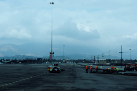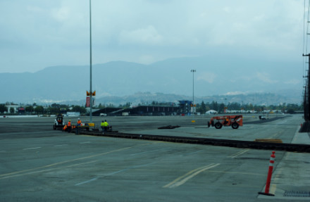 Views of the track crew working on panel track. Three more panels were needed to be put together before the engine could be moved to that end of the track.