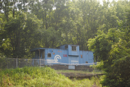 The former Reading Railroad crossed over our route outside of Bloomsburg and up on the old grade was Conrail caboose 22139, nee Reading 94100 built by International Car in 1970, part of the Whistle Stop Caboose Motel in Catawissa.
