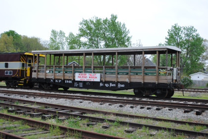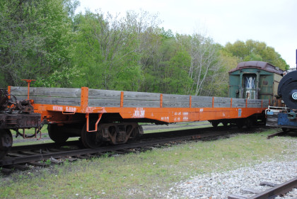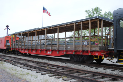Nickel Plate Road flat car 1946, nee Wheeling & Lake Erie 1946 built by Standard Steel Car in 1926. This car was coverted to haul piggyback trailers in 1956, then donated to our museum by Norfolk Southern and arrived on April 4, 1998. The museum converted the car into an open-air sightseeing car for use on our tourist trains.