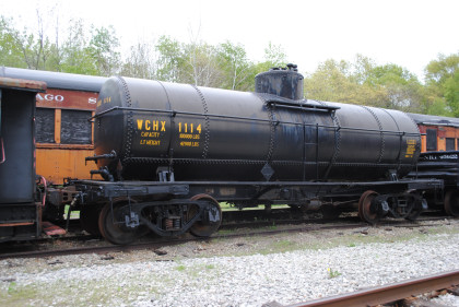 WCHX Rail tank car 1114, nee Palace Poultry Tank Car 1103, built by the American Car and Foundry in 1919. Then it was purchased by WCHX Rail and later sold to Animal Byproducts of New Carlisle, Indiana. The tank car was donated to our museum by ABP in July 1993.