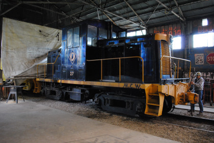 Hoosier Valley Railroad 44 ton switcher 27, ex. Port of Indiana 1776, exx. Chicago Gravel Company 509, exxx. McGraw Construction, exxxx. United States Army 7308, nee Day and Zimmerman 4-44 built by Whitcomb in 1941. It is on loan from Mike Skomac and arrived at the museum in 1988.