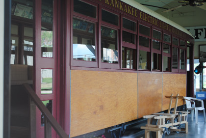 North Kankakee Electric Light and Railway Company trolley 114 built by McGuire-Cummings in 1916. The company sold the extra electricity to the City of Bradley and was organized in 1892. This trolley ran in Kankakee from 1916 until 1932 when it was replaced with buses. It ran a north-south route from Merchant Street in Kankakee, to Olivet University (former St. Viator's College) in Bourbonnais. There was a separate trolley company that ran the east-west routes in Kankakee. We have been working on its restoration for four years, and about one year of this time was spent building the trolley barn to protect it from the weather. It is 95 percent wood and it was used as a motel during the World's Fair in Chicago 1933-1934. It was later used as a carpenter's workshop and finally just for storage.