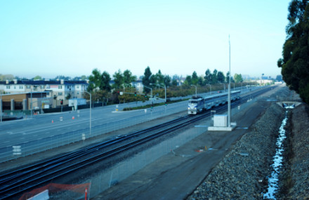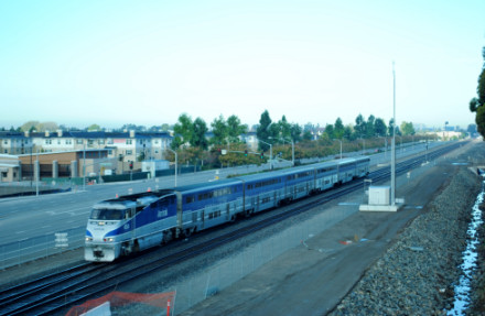 11/30/2013 Amtrak P42DC 42 was the protection unit at LAUPT so I had hoped it would be there on Saturday. My plan was to go and get some pictures of the trains at the brand new Tustin Ranch Road bridge and then ride to Los Angeles and photograph Amtrak 42. So I left the house about 7:15 AM and drove to a parking lot I found on Google Earth and parked, then started my walk.