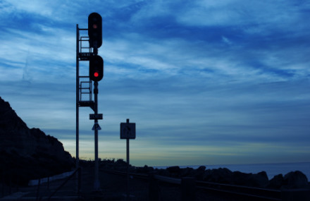 I was surprised to find a yellow over red signal. Could something be coming south? I hiked to my favorite photo location complete with a bench and sat down, enjoying the early morning sounds of surf crashing and California sea lions calling to each other out on the rock on which they live.
