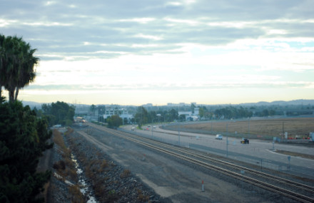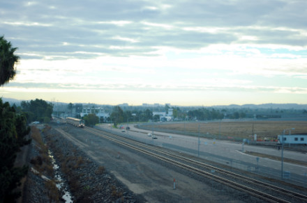 Views from my photo location. That signal soon turned green and I knew Pacific Surfliner 763 would be my first train of the day. Victor sent me a text telling me that Amtrak 42 would be on Trains 566 and 777. Thank you Victor. I could now plan my day so I would take photograph until Pacific Surfliner 566 then drive home, later ride Metrolink to Fullerton, Pacific Surfliner 774 home, then go to Chestnut Street in Santa Ana for my picture of Amtrak 42 pushing Pacific Surfliner 774 northbound. Soon, a headlight could be seen around the point to my south.