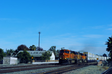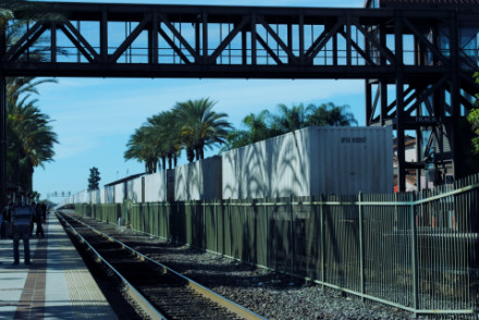 Metrolink 665 arrived and I boarded the bicycle car for the quick trip to Fullerton. Upon my arrival, there was an eastbound BNSF train waiting on a green signal and I managed to get up on the pedestrian bridge for a pair of pictures.