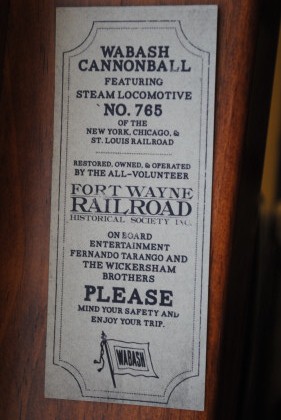 The train a consist of Nickel Plate 2-8-4 765, FWRR tool car 701 "Glenn E Brendel", Norfolk Southern coach/power car 42 "Tennessee", Norfolk Southern coach 46 "New Jersey", Norfolk Southern coach 47 "Louisiana", Norfolk Southern coach 28 "Powhatan Arrow" 800780, Norfolk Southern 29 "Powhatan Arrow" 800781, MRLX coach 4013 "Golden Surf", MRLX coach 4001 "Golden Sea", MRLX concession car 8701, MRLX coach "Bryce Canyon" 800880, MRLX coach "Silver Larch" 800728, MRLX coach "Golden Sands" 800748, San Luis and Rio Grande full dome 511 "Scenic View", San Luis and Rio Grande full dome 551 "Sky View" 800966, New York Central lounge 43 800411 and observation car "Hickory Creek" 800733. At 8:07 AM boarding commenced.