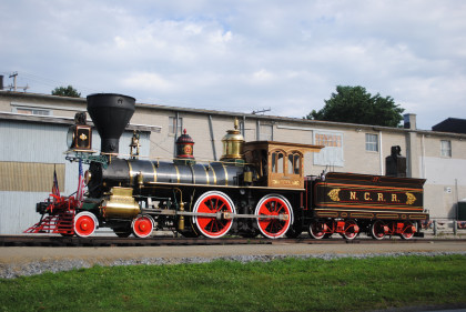 North Central Railroad 4-4-0 17 "York", built by Kloke Locomotive Works in 2013, was cold. It had to be inspected by the Federal Railroad Administration, which made no sense since it was just three months old. But with the engine herem, it made it easy to photograph.