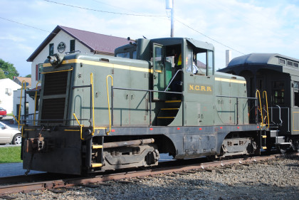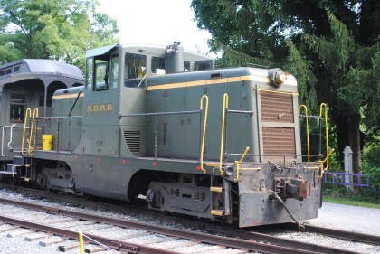 Stewartstown Railroad 44 ton switcher 10, nee Coudersport & Port Allegany Railroad D-1 built by General Electric in 1946 which was on loan since the steam engine was bad-ordered. This would push our train to Hanover Junction.