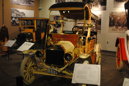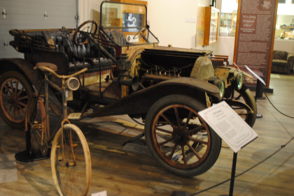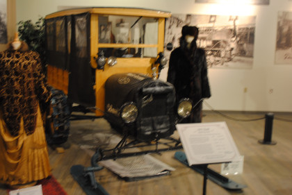 Also notice the many antique auto photos of Alaska motoring history on the museum walls. More than 70 antique photographs depicting the first automobiles to reach Alaska and its mining camps are on display, including antique the Thomas Flyer that reached Valdez during the famed 1908 New York to Paris Race. Along with this impressive display of antique photographs, the museum includes exhibits and antique movie footage that illustrate the extraordinary challenges faced by Alaska's pioneering motorists. Visitors will see examples of how Alaskans modified vehicles to travel on snow, cut firewood, ride the rails and even power a paddlewheel boat down the Yukon River.
