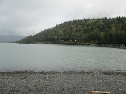 Later we rolled by Upper Trail Lake before we came to Middle Trail Lake {pictured} where we would stop for photo runby at Moose Pass. I detrained to be a part of the photo line and we walked down by the lake and I stood for the reverse move.