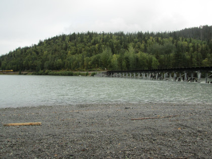The photo runby at Moose Lake. Moose Pass siding, 999 feet long was named in 1912 as a station on the Alaska Railroad and is reportedly derived from a postman's team of dogs that in 1903 had considerable trouble gaining the right-of-way from a moose.