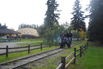The train came into the station and I took two more laps with it. I then took the fire speeder around twice and Elizabeth joined me for one lap, after which we rode the train again. Later, we caught the fire speeder coming towards us by the Totem Poles.