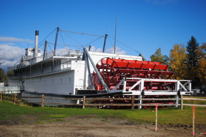 S.S. NenanaThis sternwheeler was launched at Nenana, Alaska in May 1933 and operated on the Yukon and Chena Rivers as a towboat, mainly carrying cargo, but also passengers until 1952. The Nenana is 237 feet long, 43 feet wide, has a draw of just six inches and once was rated at 1,000 gross register tons. Like many of the Alaska riverboats, the S.S. Nenana was built to serve as a packet boat - carrying passengers, freight and mail at the same time. The Nenana had accommodations for 48 passengers and 300 tons of freight. She also pushed as many as six barges loaded with merchandise. Reportedly, the S.S. Nenana is the second largest wooden vessel in the world today. Reports state that the five-deck ship "made the 774-mile voyage from Nenana to Marshall, Alaska, every two weeks during her five-month season, traveling 24 hours a day". In the early fall or in poor weather when it was dark, a huge searchlight mounted on the steamship made forward progress possible. Her boilers were wood-fired. The top speed was 17 miles per hour downstream and ten upstream. When under full steam, the boiler consumed a cord-and-a-half of firewood every hour. About 200 cords of wood were carried on the cargo deck and 16 cords piled on the bow for ballast. In 1948, the boilers were converted to oil.