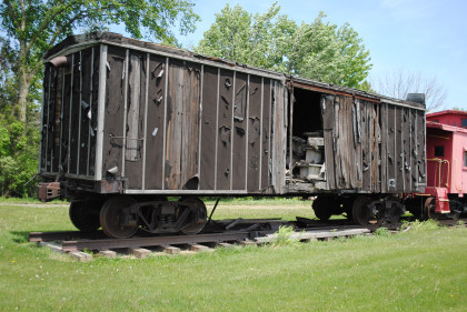A wooden box car of unknown origin.