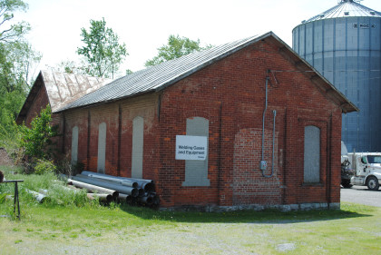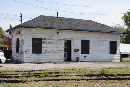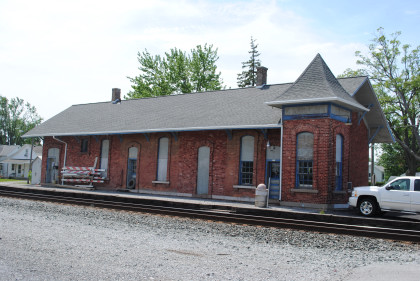 The brick Cincinnati, Hamilton & Detroit station in Ottawa was built in 1900 and replaced a wooden structure. At the time two railroads crossed where the square tower is at the northeast corner. The Cincinnati Hamilton and Dayton line ran north-south while the Findlay, Fort Wayne and Western line ran east-west. The FFW&W line has been removed. The CH&D later became B&O, which ended passenger service here in 1971. It is now owned by CSX which uses the depot for storage.