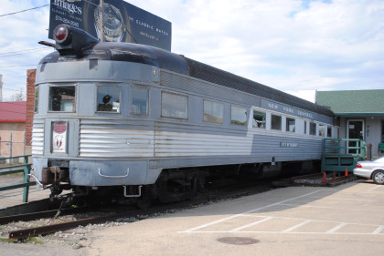 Chicago, Rock Island & Pacific observation car 454 "Minnesota", built by the Budd Company in 1937. It was rebuilt into an instruction car in 1965 and is painted as New York Central "City of Elkhart" to represent similar Budd-built observation cars that were an integral part of the post-war Great Steel Fleet of streamliners.