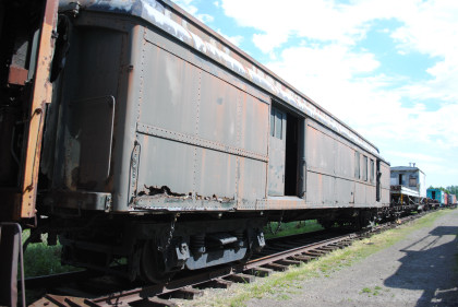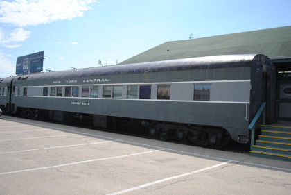 Illinois Central coach 3664 built by Pullman in 1918, later modernized and became Illinois Central 2694. Now lettered New York Central "St. Joseph River" and houses the museum's archives.