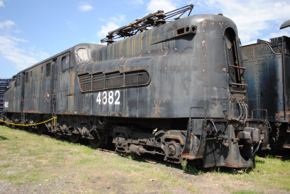 Pennsylvania Railroad GG1 4882 built by the railroad in 1939. The GG1 was designed to haul 12-14 passenger car consists on the railroad's electrified sections between New York, Washington, DC and Harrisburg, Pennsylvania. 4882 served on the Pennsy, Penn Central, Conrail, Amtrak and finally, New Jersey Transit. Retired in 1983, it was one of the last three GG1s to be used in revenue service, but had the honour of being the last GG1 to run under its own power when it pulled 4877 and 4879 into the Matawan, New Jersey yard after a "Farewell to the GG1s Day". It arrived in Elkhart in 1989 and was repainted in Penn Central livery in 1998. Today, it is the only one of the sixteen surviving GG1 locomotives to wear the black Penn Central livery.